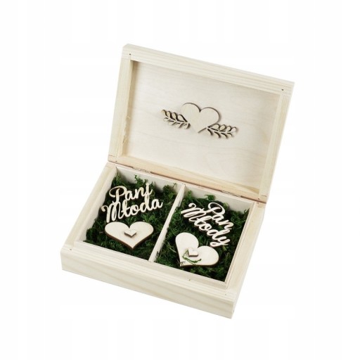 - wycinane elementy ozdobne umiejscowione na obu produktach (napis dziękujemy, 2x serduszka w laurze, 2x serduszka na obrączki, napis Pan Młody, Pani Młoda + WYBRANY ELEMENT NA FRONT SKRZYNI NA KOPERTY ORAZ NA WIECZKO PUDEŁKA NA OBRĄCZKI).