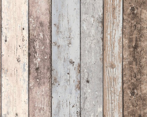 Nowoczesna tapeta przedstawiająca brązowo niebieską deskę z sękami i fugami stylizowaną na postarzaną, która daje efekt trójwymiarowości.