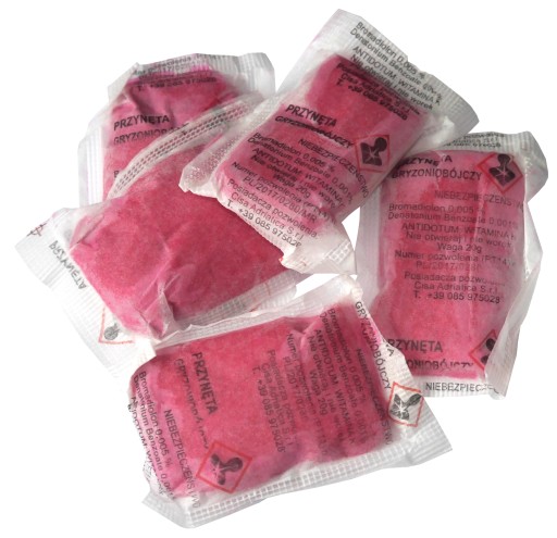 - 40 g (2 saszetki) w karmniku deratyzacyjnym umieszczonym na każde 100 m2.