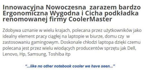 Podkładki firmy Mastercooler charakteryzują sie także wyjątkową wygodą podczas pracy. Pozwalają ustawić ekran laptopa w idealny sposób dostosowując go do poziomu oczu - najbardziej idealnej ergonomicznej pozycji do pracy! Dodatkowo cicha praca podkładki na poziomie 21db nie męczy słuchu i nie wpływa dekoncentrująco na uzytkownika