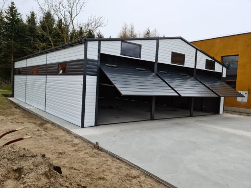 Garaż blaszany posiada zamontowane trzy bramy otwierane do góry + dodatkowe drzwi wejściowe w kolorze garażu lub do wyboru z palety RAL. Cena dotyczy bram bez silników do bram automatycznych