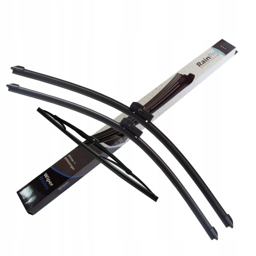 Komplet dwóch wycieraczek przednich angielskiej marki RainPro o numerze katalogowym RPA22-221 oraz wycieraczki tylnej HQ13C