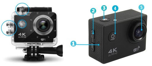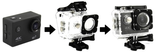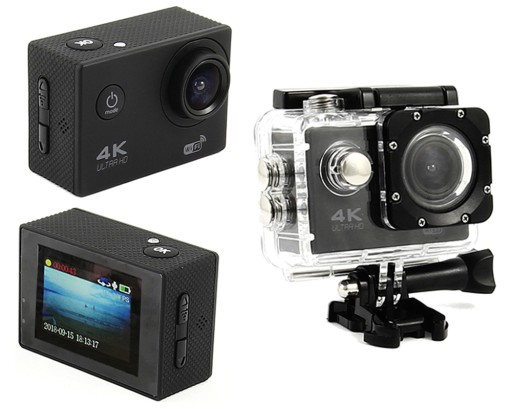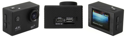 Kamera Sportowa rejestrująca obraz w jakości 4k ultra HD. W zestawie zawiera uchwyty i podstawki umożliwiające nagrywanie w każdych warunkach, nawet pod powierzchnią wody. Wodoodporna do 30m pod wodą i działająca na wysokość n.p.m.: 8 848 m