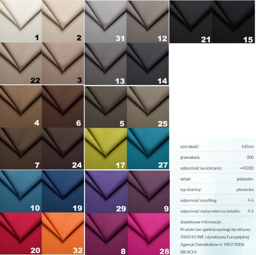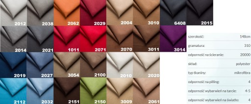 Materiał drugi typ mikrofibra dostępny w palecie kolorów jak poniżej.