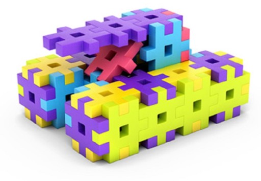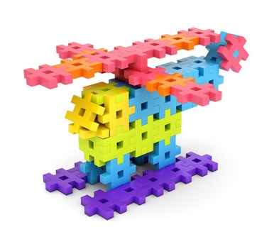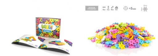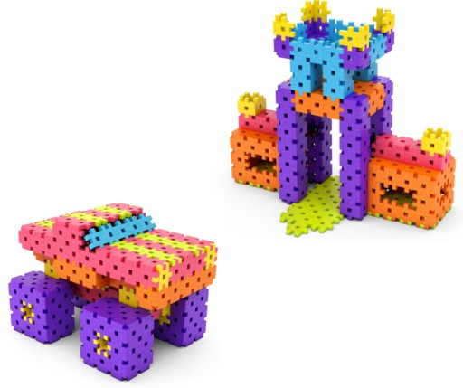 Elastyczne i przyjemne w dotyku klocki o wymiarach elementów 2,5x2,5 cm, przypominające puzzle, przeniosą malucha w świat wyobraźni. Płaskie, jednolite elementy w przyjemnych kolorach z łatwością można ze sobą łączyć za pomocą specjalnych ząbków umożliwiających budowanie płaskich oraz przestrzennych form. Konstrukcję łatwo zdemontować i uprzątnąć, gdyż klocki nie posiadają zatrzasków, zaczepów ani innych trudnych do rozmontowania części. Zatem obie czynności - łączenie jak i demontowanie, stanowią przyjazne wyzwanie dla zwinnych, małych paluszków!