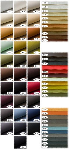 S17. biały zimny, S31. biały ciepły, S33. beżowy, S18. kremowy, S01. sepia, S02. piaskowy, S16. pomarańczowy(jasny), S04. toffi, S14. pomarańczowy(ciemny)/ceglany, S05. pistacjowy, S12. musztardowy, S13. żółtozielony, S06. zielony(zgaszony), S07. oliwkowy(ciemna zieleń), S34. kawowy, S15. brązowy(czekoladowy), S22. cynamonowy, S23. brązowy, S66. brązowy(ciemny), S19. gorzka czekolada, S10A. czerwony, S28. bordowy, S30. mleczna czekolada, S35. umbra, S24. tabaczkowy, S08. niebieski pastelowy, S09. granatowy, S29. szary(elephant) , S20. grafitowy, S32. antracyt, S11. czarny