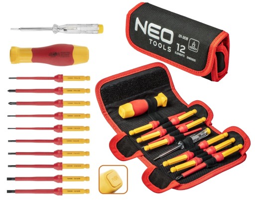 Zestaw końcówek wkrętakowych NEO, składający się z 12 elementów atestowanych do pracy pod napięciem do 1000 V.