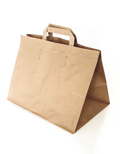 Oferujemy ekologiczne torby papierowe z płaskim uchwytem w kolorze brązowym. Oferowany na aukcji rozmiar idealnie nadaje się dla firm cateringowych