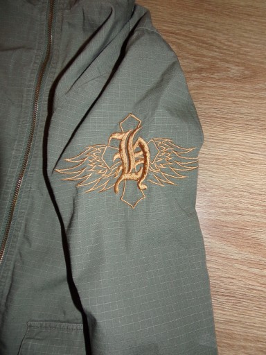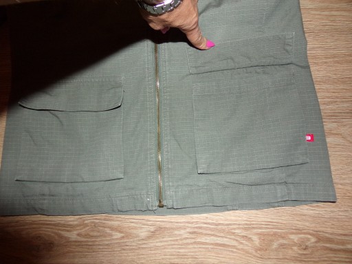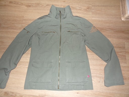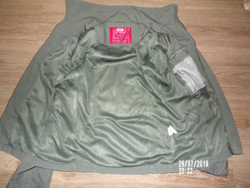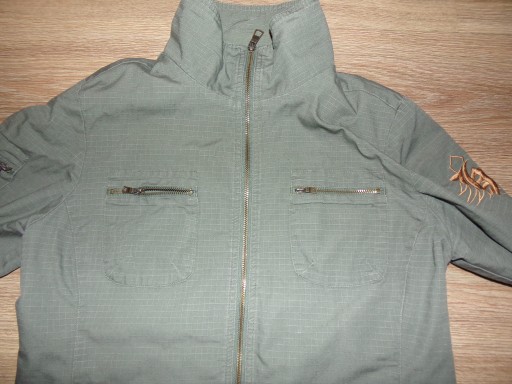 Kurtka męska Cropp wiosenno-jesienna w kolorze khaki(rzeczywisty kolor na ostatnim zdjęciu z rękawami),podszewka siateczkowa,z lewej od wewnątrz kieszeń na rzep,zapinana na suwak,ze stójką,na piersiach kieszenie na suwaki,po bokach kieszenie nawierzchniowe z klapkami,przy lewej z boku wszyta metka z logo,na prawym ramieniu kieszeń,na lewym wyszyte miodowe logo,na mankietach paseczki na rzep,stan bdb-,minus za rozjaśnione rogi kieszonek,rozmiar L,wymiary: