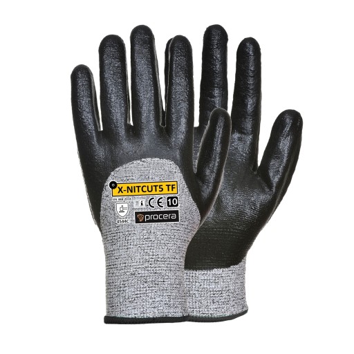 Rękawice X-NITCUT5 TF wykonane z mieszanki włókien HPPE oraz włókien szklanych o wysokim stopniu odporności na przecięcia.