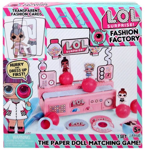L.O.L. SURPRISE FASHION FACTORY to zabawa w kreatorkę i stylistkę mody! Gracze losują kartę postaci, a następnie jednocześnie wymyślają odpowiednią stylizację, dobierając elementy stroju i dodatki. Całość umieszcza się w kuli. Gracz, który jako pierwszy stworzy 3 stylizacje i umieści je w kulach - wygrywa. Utrudnienie stanowi fakt, że kula przesuwa się na taśmociągu, a stylizację należy ukończyć zanim z niego spadnie.