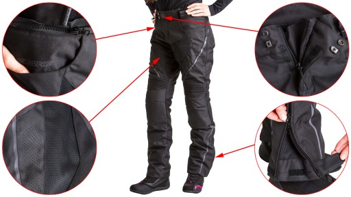 - dwa zamki (długi 360° i krótki) umożliwiają połączenie spodni z różnymi modelami kurtek