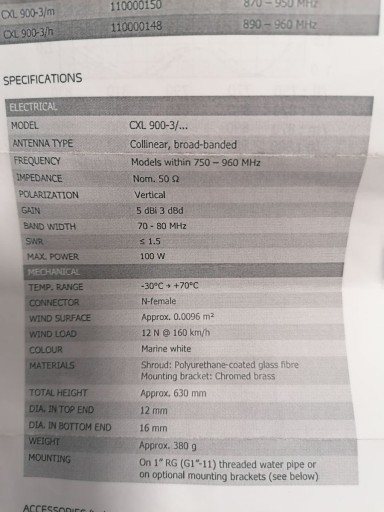 Spolaryzowana pionowo, do okólna stacja bazowa i morska antena prętowa o zysku 3 dBd dla 890 - 960 MHz do montażu na rurze gwintowanej 1 ”; szczególnie nadaje się do komórkowych radiowych sieci 900 MHz; rozszerza zakres zastosowania naziemnych systemów telefonii komórkowej na zastosowania morskie; położenie fazowe elementów promieniujących jest zaprojektowane dla maksymalnego wzmocnienia w kierunku poziomym, płaty boczne są zredukowane do minimum; najwyższa możliwa lokalizacja instalacji zapewnia najlepszy zasięg radiowy; należy unikać montażu równoległego lub w pobliżu części metalowych ze względu na możliwy wpływ SWR i promieniowania; Aby zredukować hałas atmosferyczny, wszystkie metalowe części anteny są uziemione na prąd stały - dlatego w antenie występuje zwarcie prądu stałego przez kabel koncentryczny; starannie zbudowany