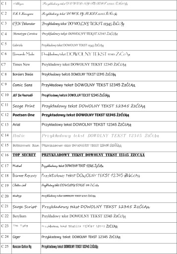 - Numer czcionki np: C24 Jeśli zabraknie tej informacji czcionka zostanie dobrana losowo.