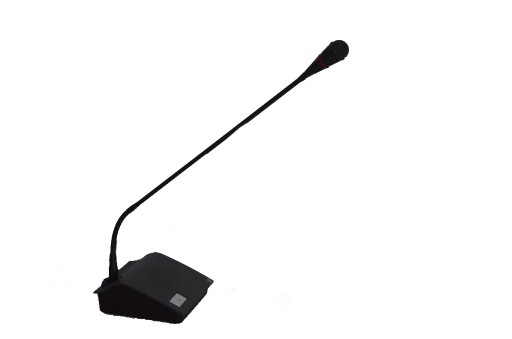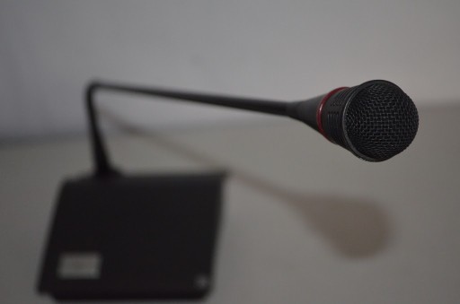 Mikrofon na gęsiej szyi ze świecącym czerwonym pierścieniem, sygnalizującym aktywność