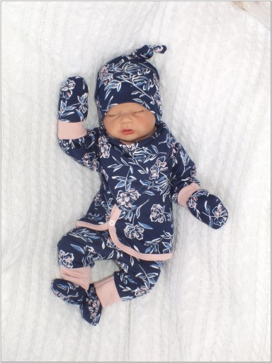 spodnie ze stópkami + body z krótkim rękawkiem-rozpinane na całej długości + czapeczka + bluza/kaftanik + niedrapki + apaszka.