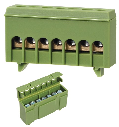 LISTWA UZIEMIAJĄCA MOSTEK, Z OBUDOWĄ IZOLUJĄCĄ, 7 OTWOROWA, ZIELONA.