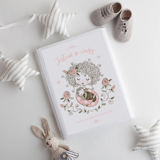 - skład: biała teczka ze sztywnej tektury zamykana na dwa rzepy, z przodu znajduje się samoprzylepna naklejka z przepiękną grafiką Przyszłej Mamusi, bobaska i napisem Jestem w ciąży, a także imieniem; wykonana z twardej tektury o grubości 2 mm; jednostronnie barwiona pokryta folią