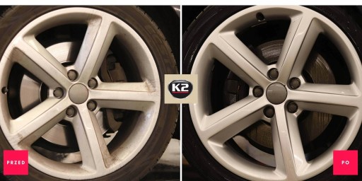 K2 ROTON w spektakularny sposób usuwa wszelkie uporczywe zabrudzenia, w tym osad z klocków hamulcowych i zabrudzenia drogowe, czego efektem jest zabarwienie naniesionego płynu na czerwono (krwawienie). Mycie felg za pomocą płynu jest szybkie, efektywne i skuteczne i nie wymaga wysiłku. Brud jest usuwany bez ryzyka zarysowania czyszczonej powierzchni.