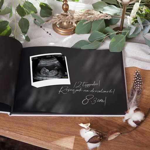 - księga będzie wyjątkowym pamiątkowym albumem dla Przyszłych Rodziców, do którego może wkleić zdjęcia z USG lub zdjęcia brzuszka ciążowego i przy pomocy białego pisaka umieścić podpisy