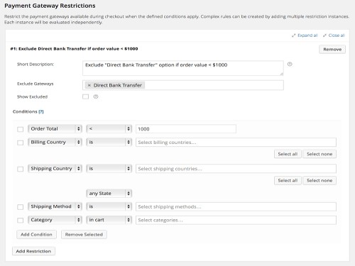 Zarządzaj dostępnymi bramkami płatniczymi oraz metodami wysyłki i krajami dostawy podczas finalizacji zamówienia przez klienta za pomocą reguł. Conditional Shipping and Payments umożliwia ograniczenie opcji wysyłki i płatności dostępnych w Twojej witrynie za pomocą logiki warunkowej.