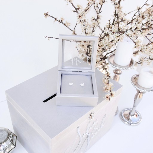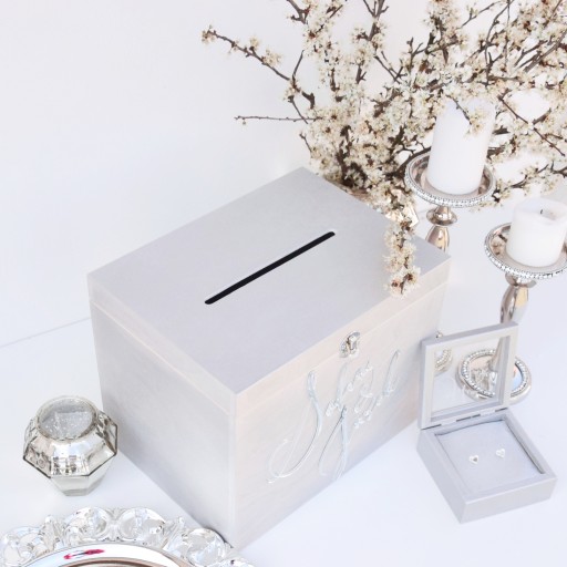 Na naszej aukcji oferujemy piękny ZESTAW W KOLORZE SREBRA ,,SZEPT PORANKA,,, :pudełko na obrączki oraz pudełko na koperty.