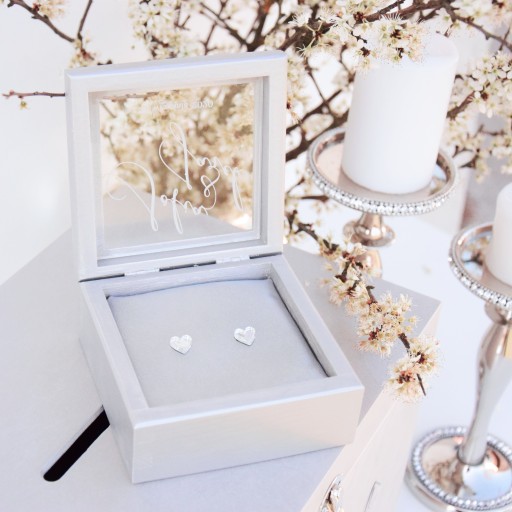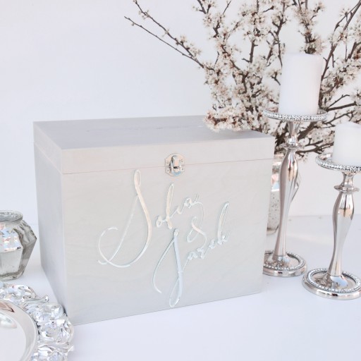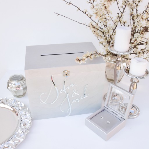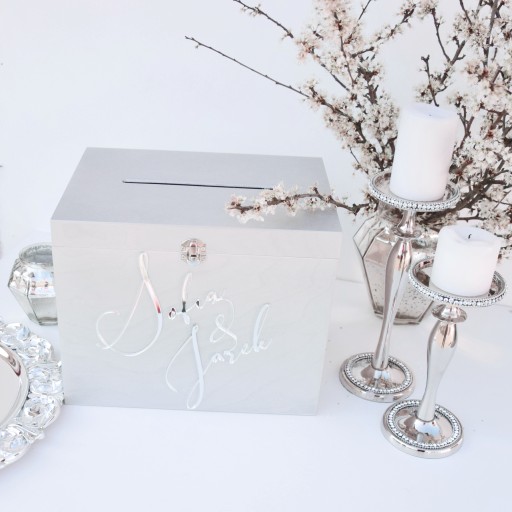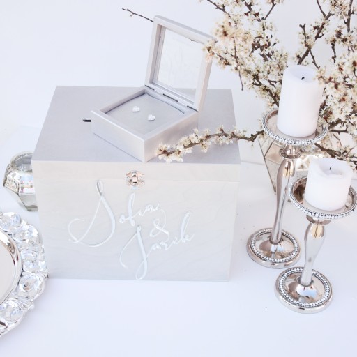 Oba przedmioty zachowany w eleganckim stylu. Na pudełkach możesz swoje imiona oraz datę.