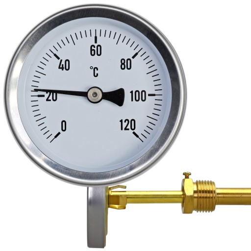 Termometr mechaniczny bimetaliczny tylny, osłona o długości 45mm z gwintem GZ1/2”, zakres pomiarowy 0...120°C, osłona montażowa w zestawie, średnica tarczy 63mm.