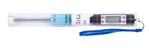 Elektroniczny, bardzo precyzyjny szpilkowy termometr z wyświetlaczem LCD, doskonale sprawdzający się w gastronomii. Zapakowany w plastikową tubę, które chroni termometr przed uszkodzeniami mechanicznymi, oraz przed skaleczeniem się szpikulcem. Termometr ten świetnie nadaje się do kontroli temperatury przyrządzanych potraw mięsnych, wypiekanych ciast oraz wszelkich płynów.