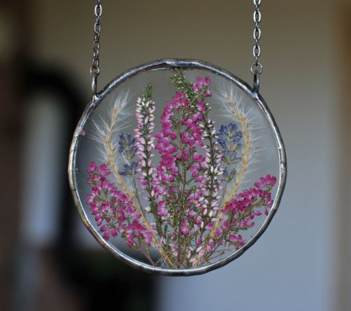Dekoracyjny witraż z kompozycją z suszonych roślin wykonany w całości w pracowni rękodzieła MARIAELA.
