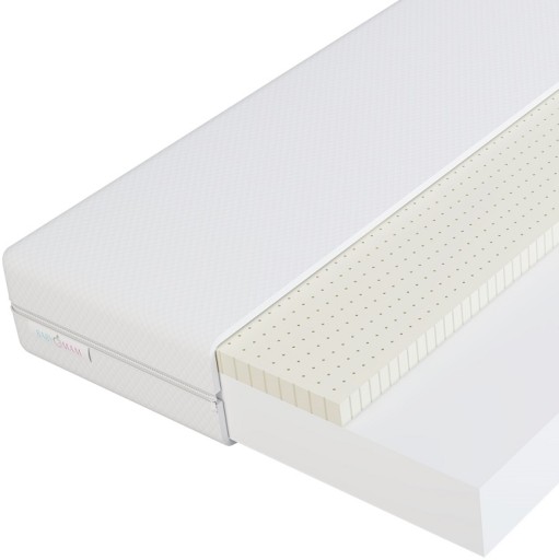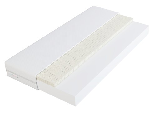 Złożony z 4 warstw: tkanina materacowa, puszysta włóknina, lateks, pianka poliuretanowa.