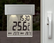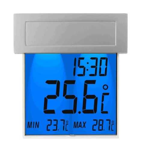 Termometr elektroniczny TFA 30.1035 VISION SOLAR zewnętrzny zaokienny podświetlany. Instrument umożliwia pomiar temperatury na zewnątrz pomieszczeń i jest przeznaczony do zawieszenia na szybie lub ramie okiennej. Montaż termometru na oknie polega na jego przyklejeniu do szyby / ramy, dzięki czemu nie ma potrzeby wiercenia otworów - jest to idealne rozwiązanie do okien plastikowych (PCV). Termometr jest zaprojektowany w taki sposób, aby w możliwie niewielkim stopniu utrudniał mycie okna - zasadniczą część termometru z ekranem można wysunąć z uchwytu. Termometr jest odporny na warunki atmosferyczne, ale w celu wydłużenia okresu jego użytkowania, jak również zoobiektywizowania pomiaru, miernik nie powinien być eksponowany na bezpośrednie promieniowanie słoneczne. Termometr posiada funkcję pamięci wartości ekstremalnych, a także wyposażony jest w zegar kwarcowy. Termometr posiada duży, czytelny wyświetlacz (97 x 85 mm), który ulega podświetleniu w momencie, kiedy urzadzenie wykryje moment zmierzchu. Możliwe jest ustawienie trybu ECO, żeby termometr był podświetlany w konkretnych godzinach (od 5:00 do 9:00 i od 19:00 do 23:00)