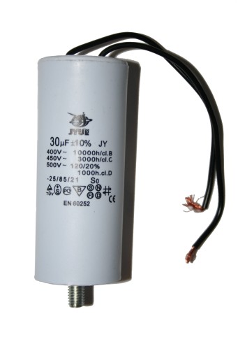 Kondensator; silnikowy (rozruchowy); 30uF; 425V AC; I150V630J-DAL; fi 45x105mm; z przewodami; śruba bez nakrętki; RoHS