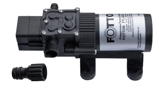 Niskonapięciowa pompa przeponowa FOTTON FTL-223 12V DC 4,3bar 10/GZ18 z szybkozłączką na wąż ogrodowy, wyposażona w automatyczny wyłącznik ciśnieniowy 4,3 bara.