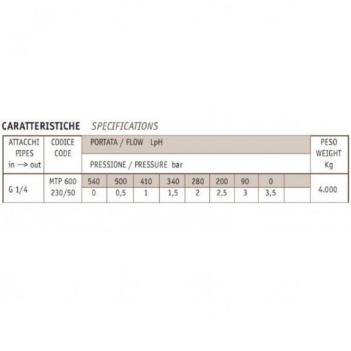 Pompa MTP 600 jest napędzana silnikiem elektrycznym 230V 50Hz. W konstrukcji zastosowano wentylator na jednej osi, z wbudowanym kondensatorem rozruchowym.