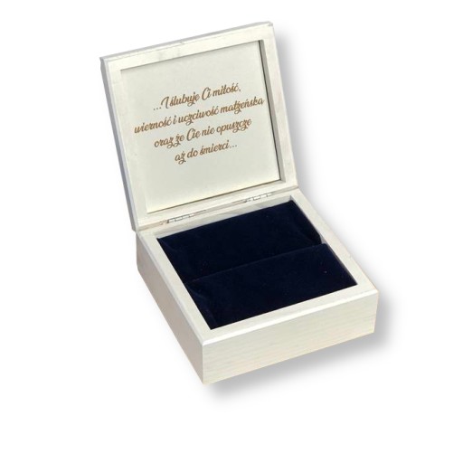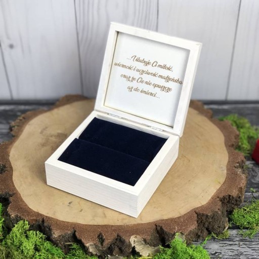 Drewniane pudełko grawerowane na obrączki malowane w kolorze białym. Na górze mieści się grawer spersonalizowany a w środku tabliczka grawerowana wraz z poduszeczką w kolorze niebieskim .