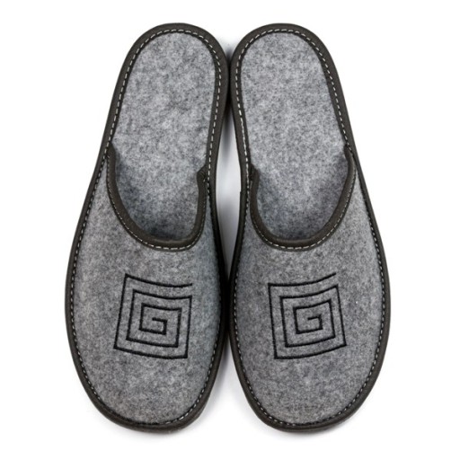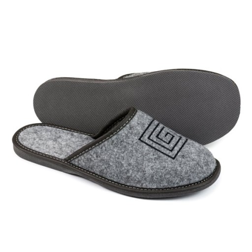 Kapcie filcowe odpowiednie dla każdego mężczyzny! Dyskretny wzór, stonowana kolorystyka i elegancka lamówka są idealnym dopełnieniem klasycznego modelu.