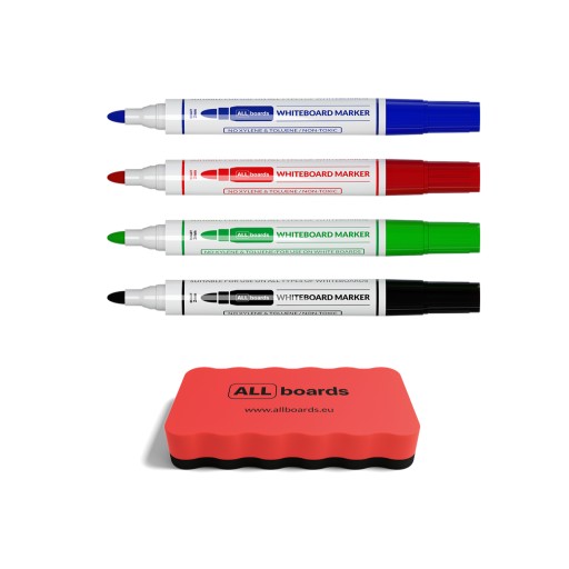 Zestaw składa się z gąbki magnetycznej i czterech markerów suchościeralnych (zielony, niebieski, czerwony, czarny).