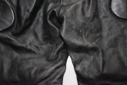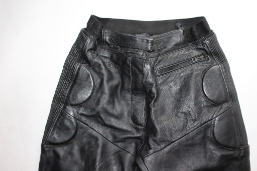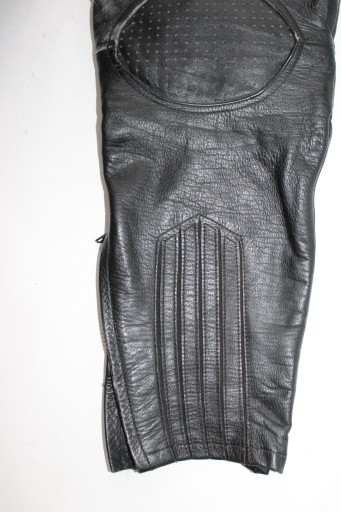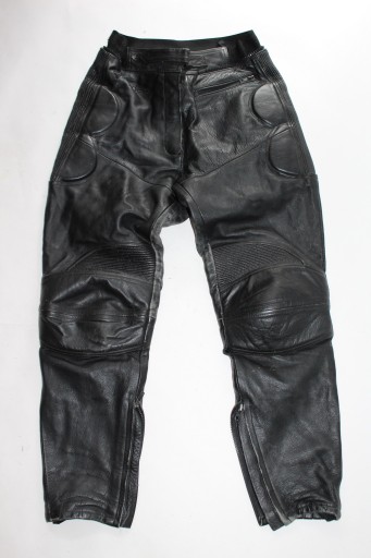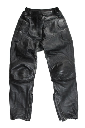 Skórzane spodnie, zapinane na zamek, paseczek, wewnątrz podszewka, w pasie gumeczka, zamek do dopicia kurtki, 1 kieszonka, biodra lekko rozciągliwe, grubsze kolana i biodra, u dołu nogawek zamek i wszyte gumeczki- używane stan dobry- widoczne ślady użytkowania- otarcia, min nadprute na szwie pod kolanem z boku.