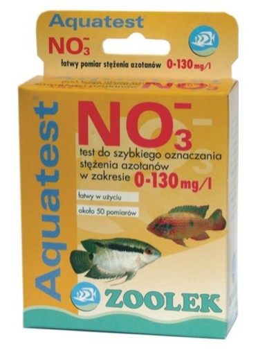 Aquatest NO3- służy do oznaczania zawartości azotanów, końcowego produktu przemiany azotu białkowego. Umożliwia pomiar w zakresie 0-150 mg/l. Pomiar wykonywany jest metodą kolorymetryczną - do odmierzonej próbki wody dodaje się kolejno odczynniki w/g instrukcji, a wywołaną barwę porównuje z krążkami skali barwnej.