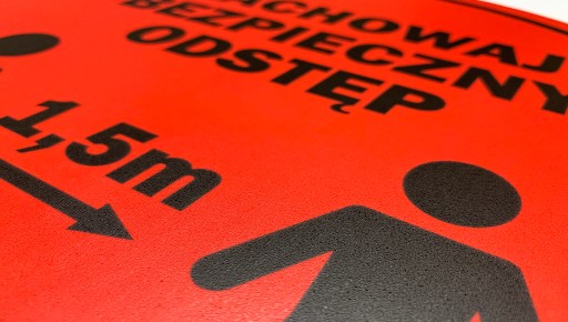 Naklejka jest pokryta laminatem antypoślizgowym (wysoka odporność na zmywanie, ścieranie, szuranie, wytrzyma ruch o dużym natężeniu).