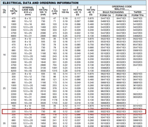 220 мкФ, 35 В, 105 футов VISHAY, низкий импеданс, длительный срок службы _x10