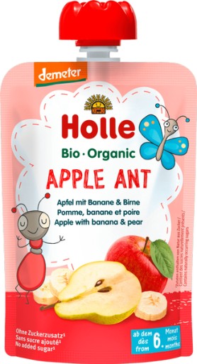 Delikatne puree 100% owoców dla dzieci, które skończyły 6 miesięcy. Przygotowane w oparciu o dojrzałe banany, jabłka i gruszki zamknięte w praktycznej saszetce z możliwością ponownego zamknięcia: praktyczne w podróży, łatwe do użycia. Banany to skarbnica potasu ale także wielu witamin takich jak A, C, E, K oraz tych z grupy B, błonnika oraz wielu składników mineralnych: magnezu, fosforu i wapnia. Gruszki, jako jedne z nielicznych owoców, zawierają jod minerał pozytywnie wpływający na funkcjonowanie tarczycy. Ponadto gruszki na tle innych owoców wyróżniają się zawartością boru pierwiastka wspomagającego pracę szarych komórek oraz poprawiającego możliwości koncentracji oraz utracie wapnia z kości. Natomiast jabłka, które są nie tylko cennym źródłem witaminy C, za sprawą błonnika regulują pracę jelit i chronią przed zaparciami. Żywność opatrzona etykietą Demeter uprawiana jest według surowych standardów rolnictwa biodynamicznego w zgodzie z naturą.