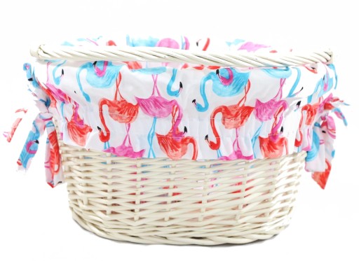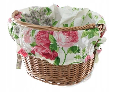 Materiał do kosza posiada gumkę, dzięki czemu idealnie wpasowuje się we wnętrze koszyka, po bokach sznurki, które można związać w kokardkę.