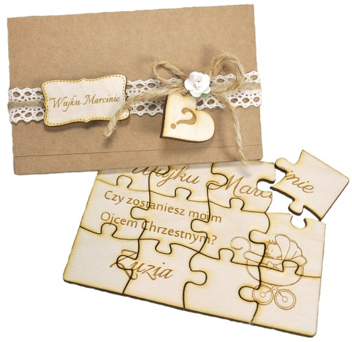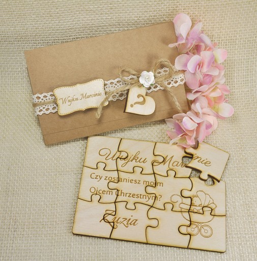 Puzzle wykonane są z drewna, na poszczególnych elementach wygrawerowany jest tekst pytania - sedno sprawy ;) Oczywiście zapytanie jest spersonalizowane - grawerujemy zarówno imię przyszłej chrzestnej czy chrzestnego oraz imię dziecka.