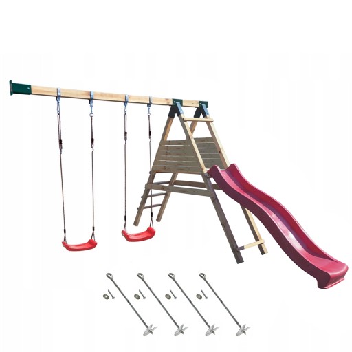 W skład zestawu wchodzi: drewno, łącznik potrójny 2 sztuki, mocowanie do wieży lub domku, 1 sztuka, 4 objemy do huśtawki, 2 huśtawki