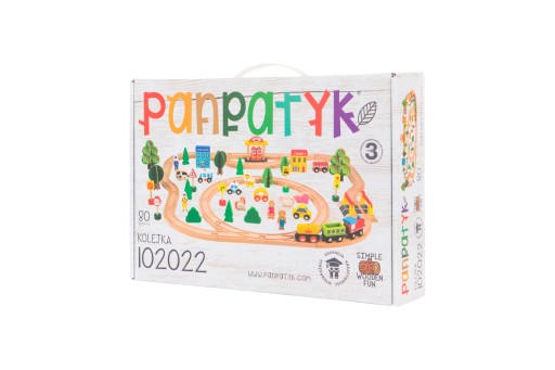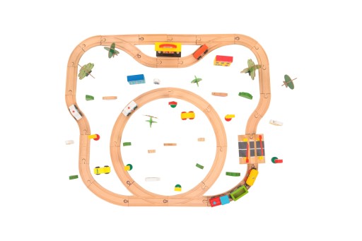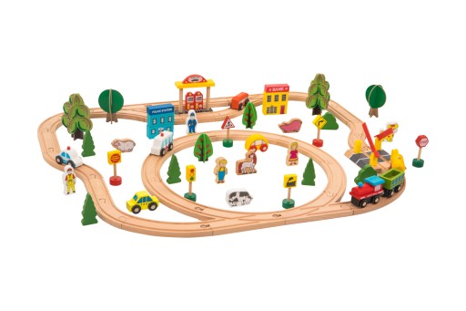 Drewniany tor dla dzieci to aż 80 drewnianych elementów, które można poskładać według uznania. Znajdują się tutaj elementy toru, ciuchcia, pojazdy, znaki drogowe, drzewka, domki i ludziki