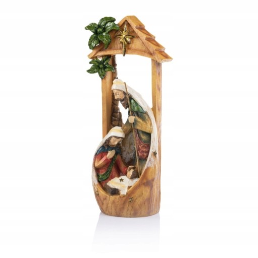 Stajenka, w której znajdują się postaci Świętej Rodziny, stylizowana jest na pień drzewa.