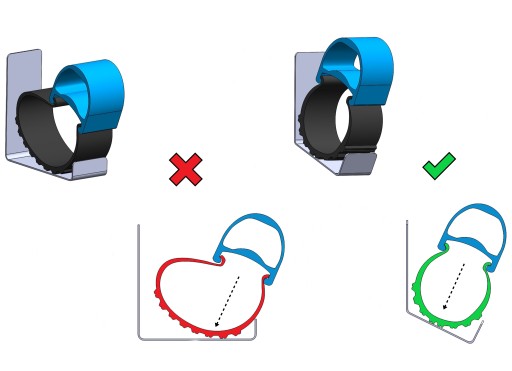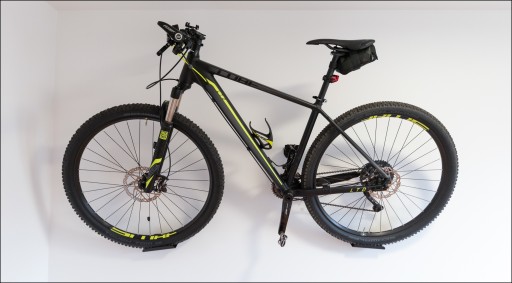 - Wieszak został zaprojektowany tak, aby pod wpływem własnej masy roweru minimalizować skłonność do odkształcania się opony i powstawania mikro pęknięć w wyniku działania nierównomiernie rozłożonych, skręcających (bocznych) sił nacisku, oraz ograniczyć efekt "bujania" się roweru.