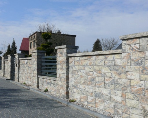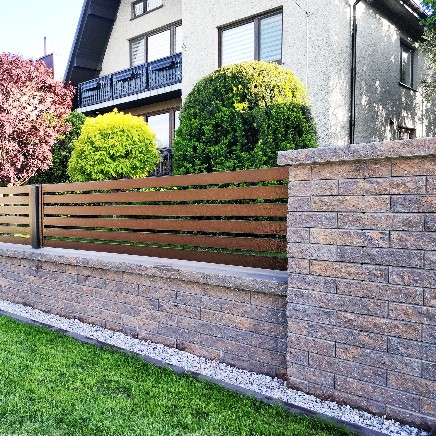 Nowoczesny system ogrodzeniowy, który charakteryzuje się prostymi kształtami. Delikatna linia fug podkreśla geometryczny charakter całości.